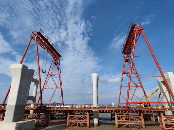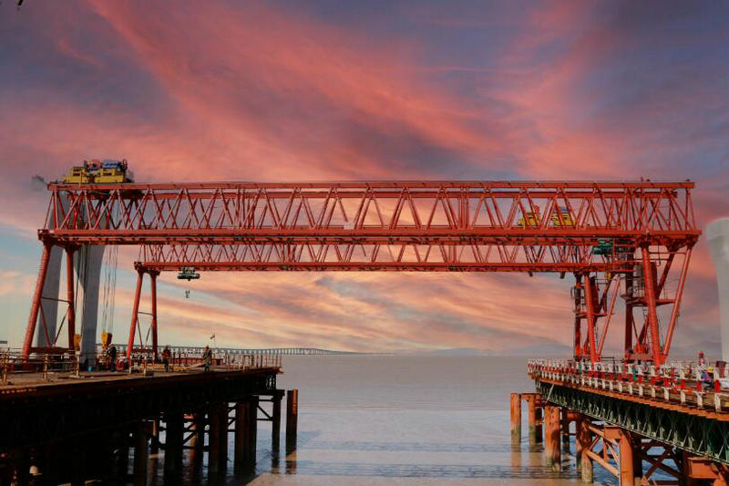 濱?;ネㄔO計142片鋼箱梁、299片疊合梁,單片重20—30噸、長20—60米,架設好的30片梁,一部分是通過公路從舟山梁場運至現(xiàn)場,一部分是海上運輸至石化區(qū)碼頭,轉運至工地。由于梁體超長超寬,公路運輸安全風險大,租賃石化區(qū)碼頭卸梁再轉運,費時費力,影響進度。該項目部從安全、效率、成本等多方面考慮,決定在互通區(qū)建1座卸梁站、2座提梁站。前期經過實地勘察,確定了卸梁站和2座提梁站位置,組織人員編制出實施方案,經多方專家評審通過,報業(yè)主、鎮(zhèn)海區(qū)海事處審批后付諸實施。在聯(lián)系聯(lián)系廠家加工龍門吊的同時,組織力量拆除區(qū)域內的棧橋,深挖卸梁站航道內的淤泥,克服多種困難,于7月13日建成36,4米高、16,8米寬的卸梁站。在兩座提梁站建設中,該項目部戰(zhàn)勝高溫、大風大雨等極端天氣造成的困難,8月初建成1號提梁站并通過有關方面驗收。在2號提梁站施工中,遭遇兩次強臺風,施工受阻,項目部采取科技公關、優(yōu)化資源等舉措,將臺風造成的損失奪了回來,如期建成74米長、36米高、15米寬、負荷200噸的2號提梁站。兩座提梁站和1座卸梁站使用鋼材250余噸。