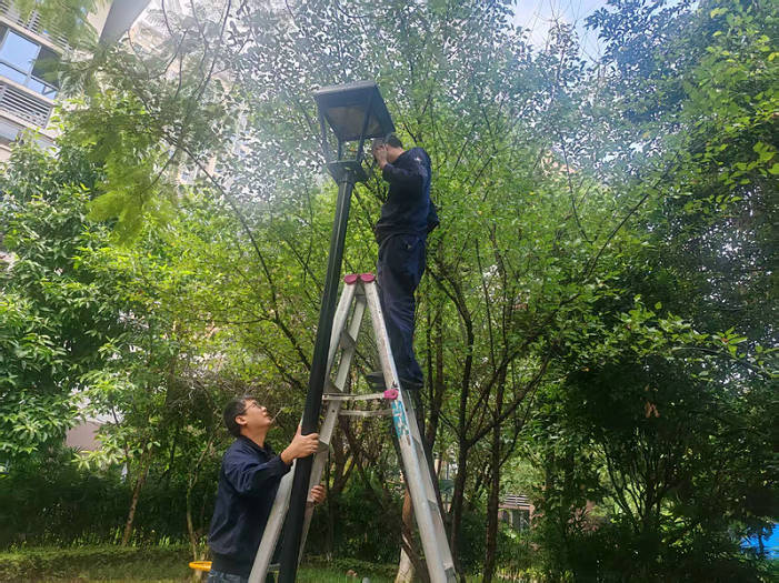 夜幕降臨時(shí),他們化身“光亮守護(hù)者”穿梭于樹(shù)叢樓宇間。搭梯登高檢修路燈線(xiàn)路、手持加長(zhǎng)工具清潔燈罩、加固燈桿、排查線(xiàn)路、更換燈泡、調(diào)試亮度,每一個(gè)步驟都一絲不茍。維修員們用專(zhuān)業(yè)操作確保每一盞路燈準(zhǔn)時(shí)亮起,為居民夜間出行鋪就安全通道。