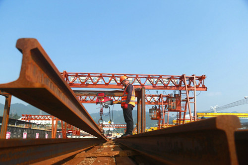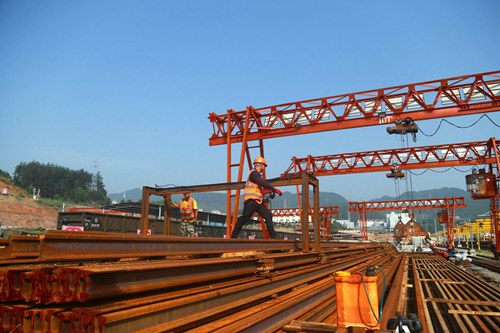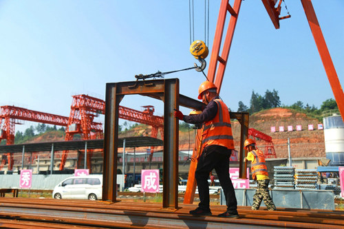 (譚帥)“確認夾板掛裝牢固,準備起吊,速度一定要慢,確保安全”,5月18日,渝懷鐵路涪秀二線中鐵一局鋪架項目的釘聯(lián)生產(chǎn)區(qū)內(nèi)迎來了新“神器”。當天上午9時許,隨著兩臺小行吊設(shè)備的緩緩滑動,一節(jié)長25米的鋼軌成功起吊,隨后工人們十分順利地開始鉆孔作業(yè)工序。