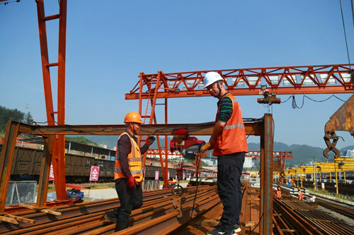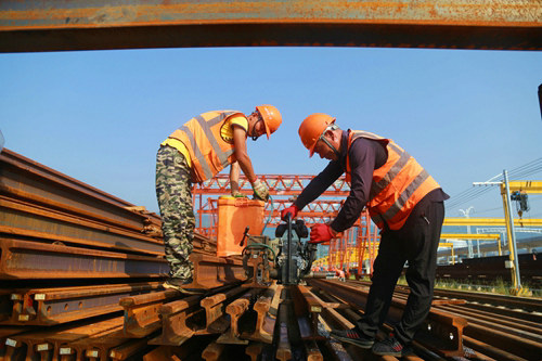 工人們對調(diào)整好位置的鋼軌輕松進行鉆孔作業(yè)