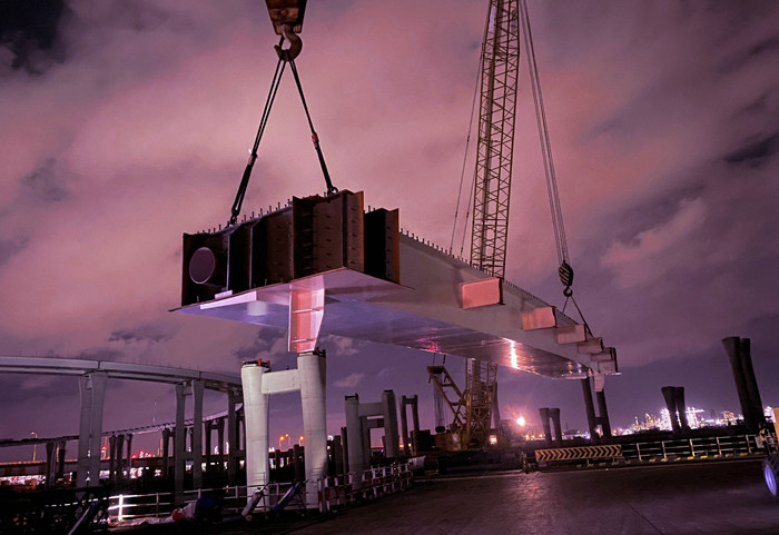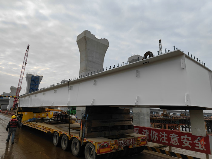 濱?;ネㄖ骶€(xiàn)全長(zhǎng)2390米、8座匝道橋5995米的、4座拼寬橋1320米,設(shè)634個(gè)墩柱、67聯(lián)441片鋼混組合梁,使用鋼材31593.7噸、混凝土29418.9立方。鋼箱梁由寧波舟山一廠(chǎng)家生產(chǎn)。去年12月通過(guò)海上運(yùn)輸、碼頭卸裝和轉(zhuǎn)運(yùn),將鋼箱梁運(yùn)至現(xiàn)場(chǎng),29日上午架設(shè)第一片梁,3天架設(shè)3跨6片,受海風(fēng)、臺(tái)風(fēng)等影響,直到今年6月8日到15日進(jìn)行第二波架梁,完成12跨24片架梁任務(wù),前兩波共架設(shè)30片梁。