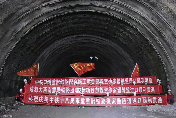 中鐵十八局集團重黔高鐵6標(biāo)徐家堡隧道進口較原計劃提前185天順利貫通( 田緣圓 攝 )