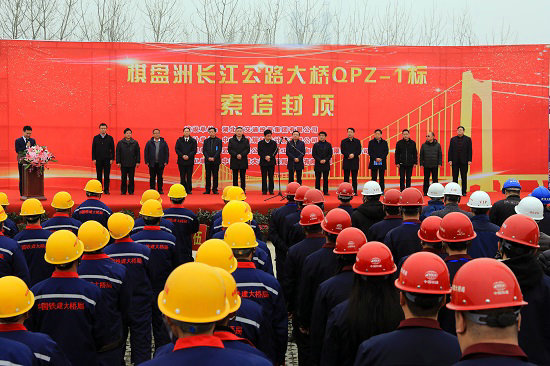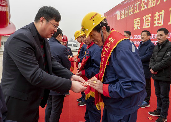 儀式上,蘄春縣人民政府副縣長(zhǎng)李國(guó)忠致辭;湖北棋盤洲長(zhǎng)江公路大橋有限公司副總經(jīng)理、總工程師趙文藝致辭,中鐵建大橋工程局集團(tuán)一公司執(zhí)行董事、黨委書記王學(xué)民致辭;蘄春縣政協(xié)主席蔡緒銀、湖北棋盤洲長(zhǎng)江公路大橋有限公司副總經(jīng)理汪應(yīng)軍、中鐵建大橋工程局集團(tuán)橋梁指揮部副指揮張耀為3名“最美工匠”頒獎(jiǎng);湖北棋盤洲長(zhǎng)江公路大橋有限公司董事長(zhǎng)、總經(jīng)理汪西華宣布北索塔最后封頂。