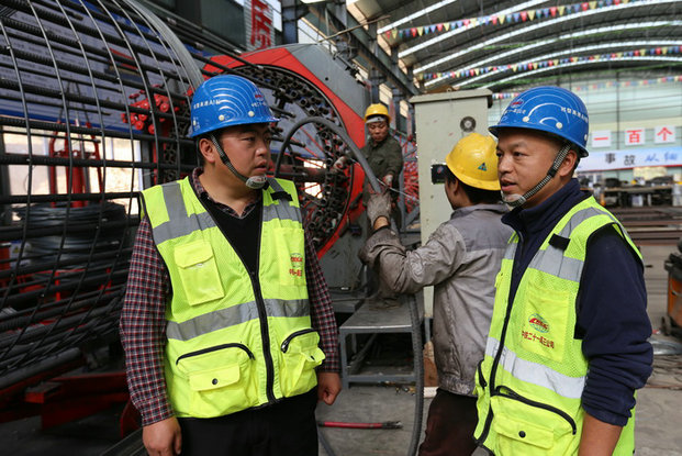 圖為楊鵬濤(左)在檢查鋼筋加工廠生產(chǎn)情況 說起建設(shè)拌合站的難度,楊鵬濤深有感觸。工地沒電、沒水,他和兩名老職工、兩名民工,每天早晨6點半吃完早餐,就帶著兩瓶開水上工地,晚上十一、二點才回項目部,在工地吃了兩個多月的盒飯。拌合站一開工就遇到梅雨季節(jié),為了趕工期,幾乎天天冒雨作業(yè)。下雨時就打傘或穿雨衣指揮機械作業(yè),小雨不停施工,大雨就排水,在建設(shè)拌合站期間,楊鵬濤沒有離開過工地半步,他一個人就用壞了4把雨傘。高峰時共有14臺挖機、裝載機3臺、壓路機1臺,自卸車7、8臺投入施工。他怕一離開現(xiàn)場,這么多機械車輛窩工,會給項目部造成損失。他說:“現(xiàn)場管理人員,在與不在工地,施工效率肯定是不一樣的。”