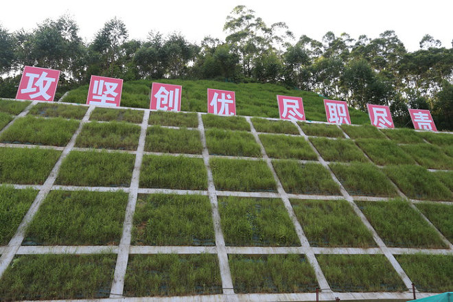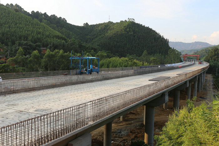 大橋架梁后準(zhǔn)備橋面系施工今年春節(jié)后,國(guó)家環(huán)保局進(jìn)駐廣西,六賓高速環(huán)保要求嚴(yán)。南國(guó)山清水秀,植被茂盛,沒有裸露的山體,為了保護(hù)綠水青山,前期項(xiàng)目部施工就制定了路基高邊坡開挖、綠化同時(shí)進(jìn)行的施工方案。王亞輝不辭辛勞,每天都要去現(xiàn)場(chǎng)巡視,檢查掛網(wǎng)噴草施工情況。如今路基還正在施工,高邊坡兩側(cè)也是綠草茂盛,與翠綠的山林渾然一體。