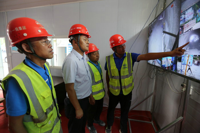 王亞輝(左二)與現(xiàn)場(chǎng)管理人員、技術(shù)人員觀看洞內(nèi)監(jiān)控情況一個(gè)項(xiàng)目的成敗,前期策劃是關(guān)鍵。為此,王亞輝和經(jīng)理王永奇對(duì)現(xiàn)場(chǎng)詳細(xì)踏勘了十幾次,并邀請(qǐng)公司、集團(tuán)公司及外部專家到現(xiàn)場(chǎng)指導(dǎo),明確了項(xiàng)目的關(guān)鍵線路為架梁通道,控制性工程為陳平互通360萬(wàn)方挖方,填方240萬(wàn)方。