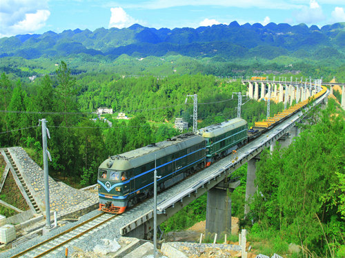 雙機牽引的首列長軌車運行在鐵爐堡特大橋上