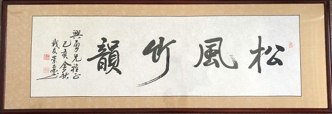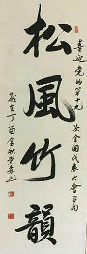 應(yīng)該說王崇森戰(zhàn)友的這禎“松風(fēng)竹韻”書法作品是我倆結(jié)緣的伊始。2017年10月初,我是在微信《政友群》中看到王崇森戰(zhàn)友曬出的這幅作品,這禎書法是其參加中鐵十五局集團公司工會、老年體協(xié)舉辦的“迎接黨的十九大召開、慶祝建軍90周年”老年職工書畫、攝影作品展上的獲獎作品。我一看到這幅書法作品就非常的欣賞與喜愛,尤其是書法作品中四個字的詞意也很適合時宜。當(dāng)時我就有點心血來潮地隨即用“松風(fēng)竹韻”四字為題寫了首藏頭詩發(fā)在微信群中表示點贊與恭賀。