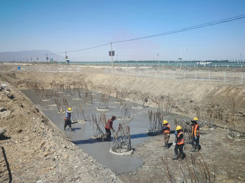 圖為新疆兵團(tuán)建工水電集團(tuán)市政路橋公司第五師雙河市G577沙山子-G219線公路(互通立交工程)主線橋K8+175.5 左右幅0號(hào)橋臺(tái) 墊層混凝土澆筑 王小丫 攝