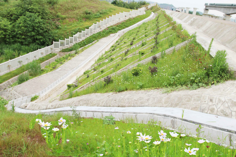 花團(tuán)錦簇的路基護(hù)坡一角 橋墩作業(yè)完成后及時(shí)植綠種草,做到黃土不漏天