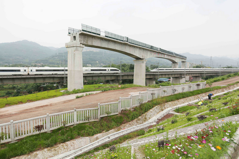 近日,筆者走進(jìn)正在建設(shè)中的中鐵十五局集團(tuán)重慶鐵路樞紐東環(huán)線DHZQ-1標(biāo)項(xiàng)目工地,放眼望去,滿眼綠色,綠色的路基護(hù)坡、綠色的防護(hù)柵欄、綠色的山體防護(hù)。聳立在鮮花綠草之上,與既有鐵路相向而行,整齊排列的光潔亮麗的橋墩等等,新建鐵路與既有渝貴高鐵線路只有十幾米之遙,但乘上既有線的高鐵列車,你也同樣會(huì)有“人在車上坐、車在畫中行”的美好感受與暢想……