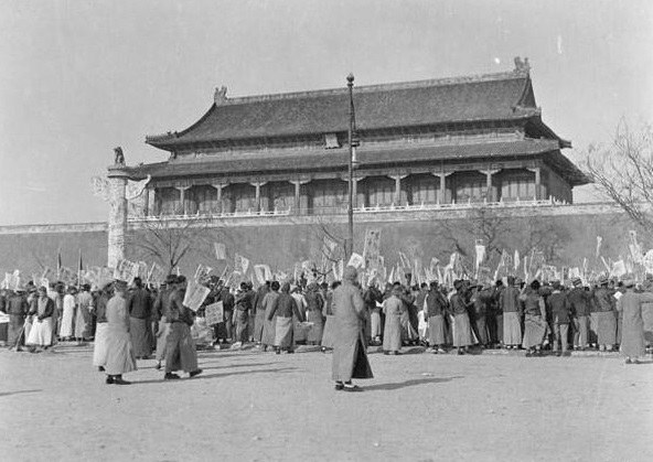 圖為北京民眾及大學(xué)生聚集在天安門(mén)廣場(chǎng)前的照片