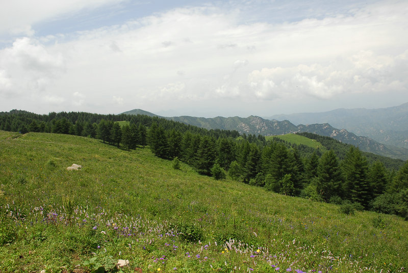 我的目的地是一座海拔1500多米的大山“馬圈背”。這座山上的山蔥像人工播種的一樣,遍地都是。我先爬上“盤道”山,再走進(jìn)“馬圈背”。我在大約40度的山坡上老牛一樣爬行著。山坡的低處布滿雜草和野花,解放前,這里是一片白樺林,60年代白樺林變梯田,種植燕麥、山藥、蘿卜等農(nóng)作物,再后來逐漸荒蕪。往上走300多米便進(jìn)入林區(qū)。我在一條雞場(chǎng)小路上時(shí)而迂回、時(shí)而直行,走10幾分鐘便稍作休整。