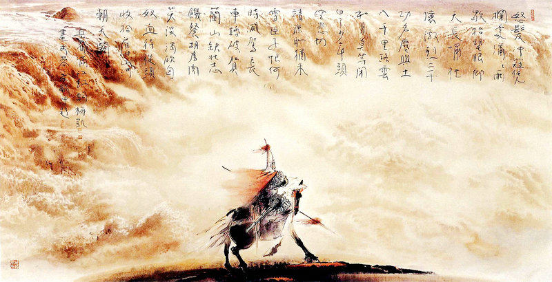 靖康恥,猶未雪。臣子恨,何時滅。駕長車,踏破賀蘭山缺。壯志饑餐胡虜肉,笑談渴飲匈奴血。待從頭、收拾舊山河,朝天闕。