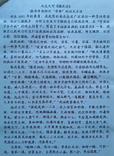 在明朝崇禎年間的1641年,又出現(xiàn)了一次全國瘟疫橫行,十戶九死 。據(jù)史料記載:在南北直隸、山東、浙江等地大疫,五六月間益盛,“一巷百余家,無一家僅免,一門數(shù)十口,無一僅存者”。當(dāng)時的醫(yī)家吳又可親歷了疫情,積累了豐富的資料,推究病源,潛心研究,依據(jù)治療經(jīng)驗所得,撰寫成了全新的《瘟疫論》一書。