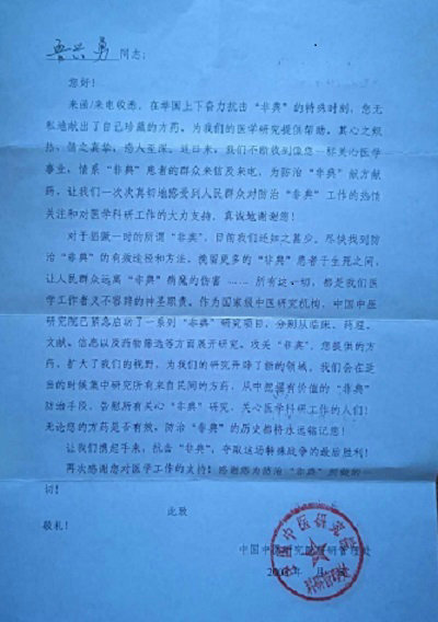 我作為一名基層中醫(yī)醫(yī)生,雖然不能直接參與到抗擊“非典”的一線,但也可以向當(dāng)時的衛(wèi)生行政部門領(lǐng)導(dǎo)提出建議與獻方獻策,于是便向吳儀副總理寫了這封建議信與附件。隨后由國家中醫(yī)藥管理局和中國中醫(yī)研究院給予了回復(fù)。
