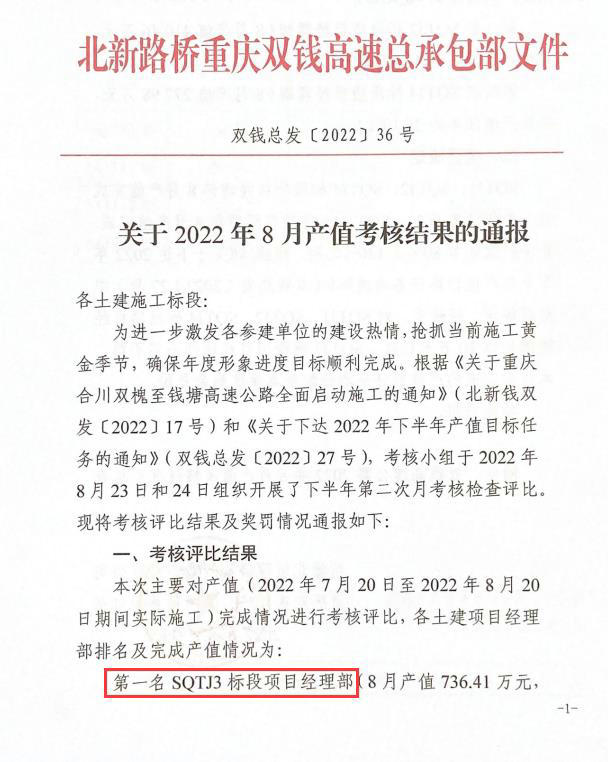 重慶訊(通訊員 翟潤(rùn)潔)近日,北新路橋集團(tuán)長(zhǎng)沙分公司重慶雙錢高速公路土建施工SQTJ3標(biāo)段項(xiàng)目傳來捷報(bào),該標(biāo)段在錢雙公司下半年第二次月考核檢查評(píng)比中獲得第一名。