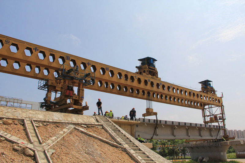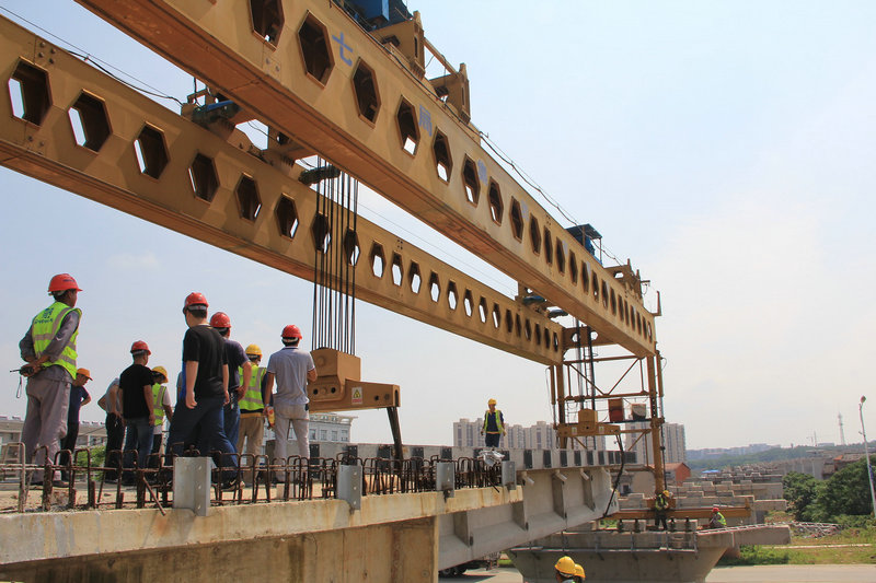 在新港江北鐵路繞城特大橋頭,這里艷陽高照,三十多名施工人員奮戰(zhàn)于此,工地上一派繁忙景象。據(jù)施工現(xiàn)場(chǎng)負(fù)責(zé)人趙建平介紹,首片T梁從制作到養(yǎng)護(hù)完成共需要10天,端午節(jié)前就做好了各項(xiàng)準(zhǔn)備工作,節(jié)后一開工,他們便立即投入到了緊張施工之中,本次T梁架設(shè)架設(shè)僅用時(shí)50分鐘,整個(gè)起吊、推送、橫移、落梁、就位動(dòng)作一氣呵成,工序銜接順利,歸功于前期項(xiàng)目部的精心組織,細(xì)心安排,才保證了架設(shè)全過程安全、平穩(wěn)、有序、可控。